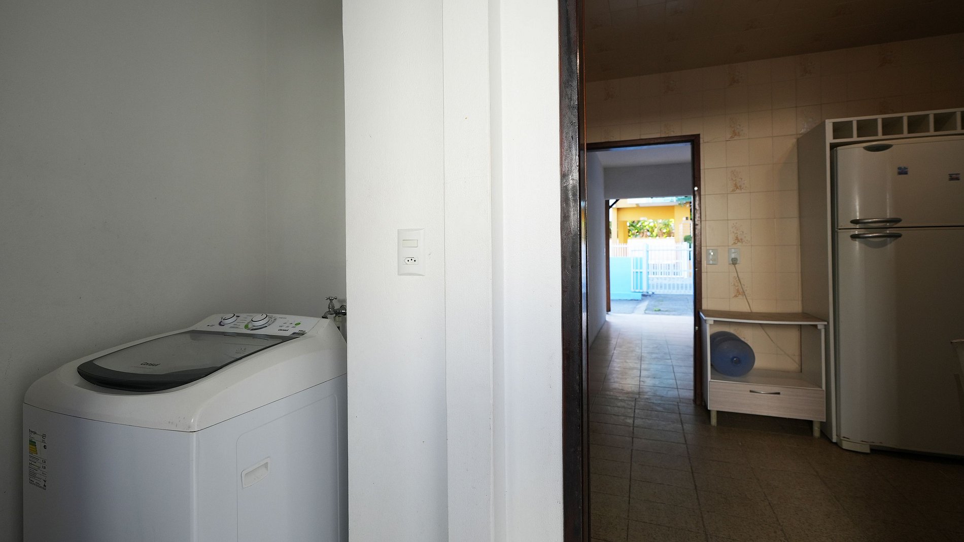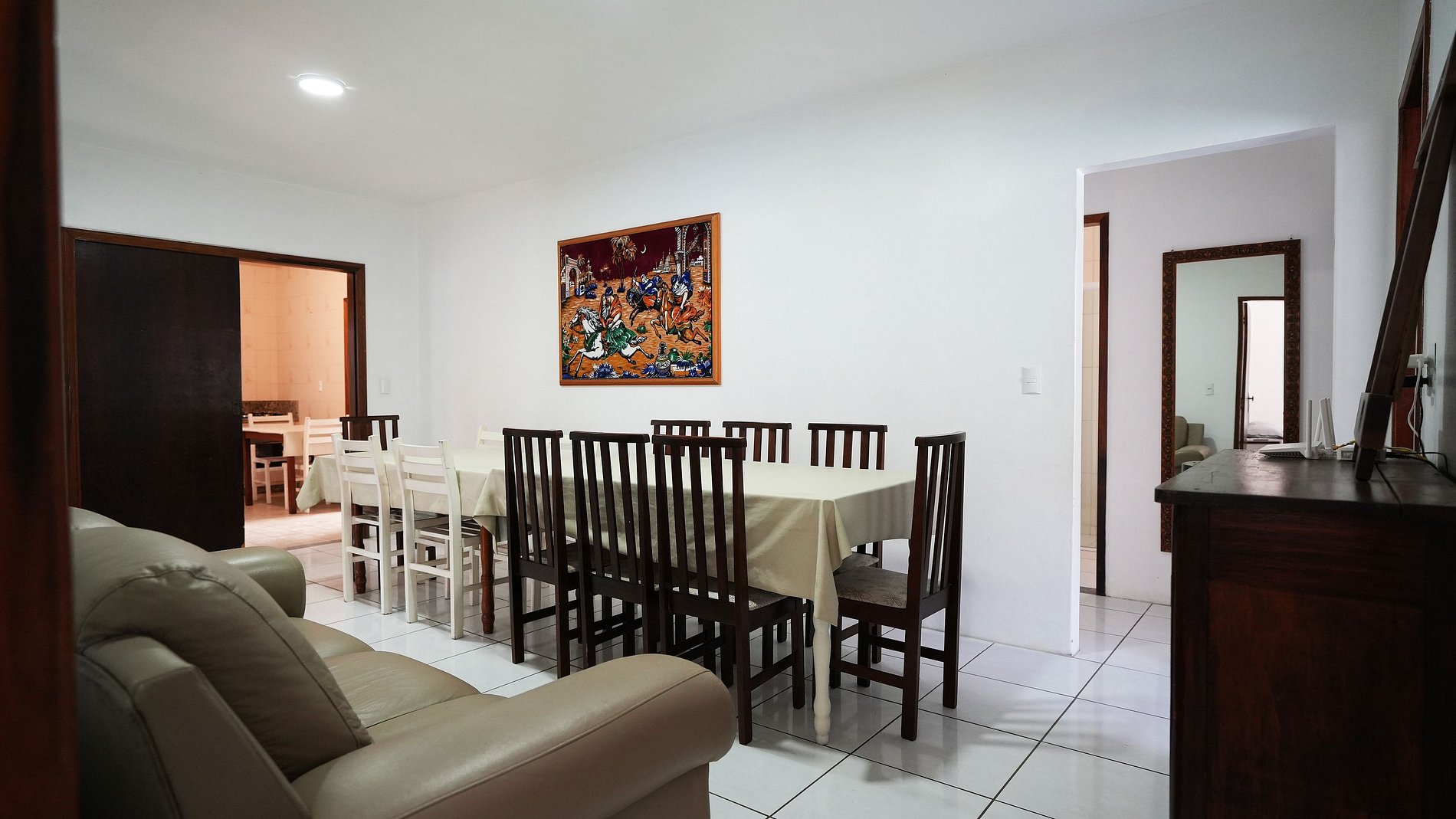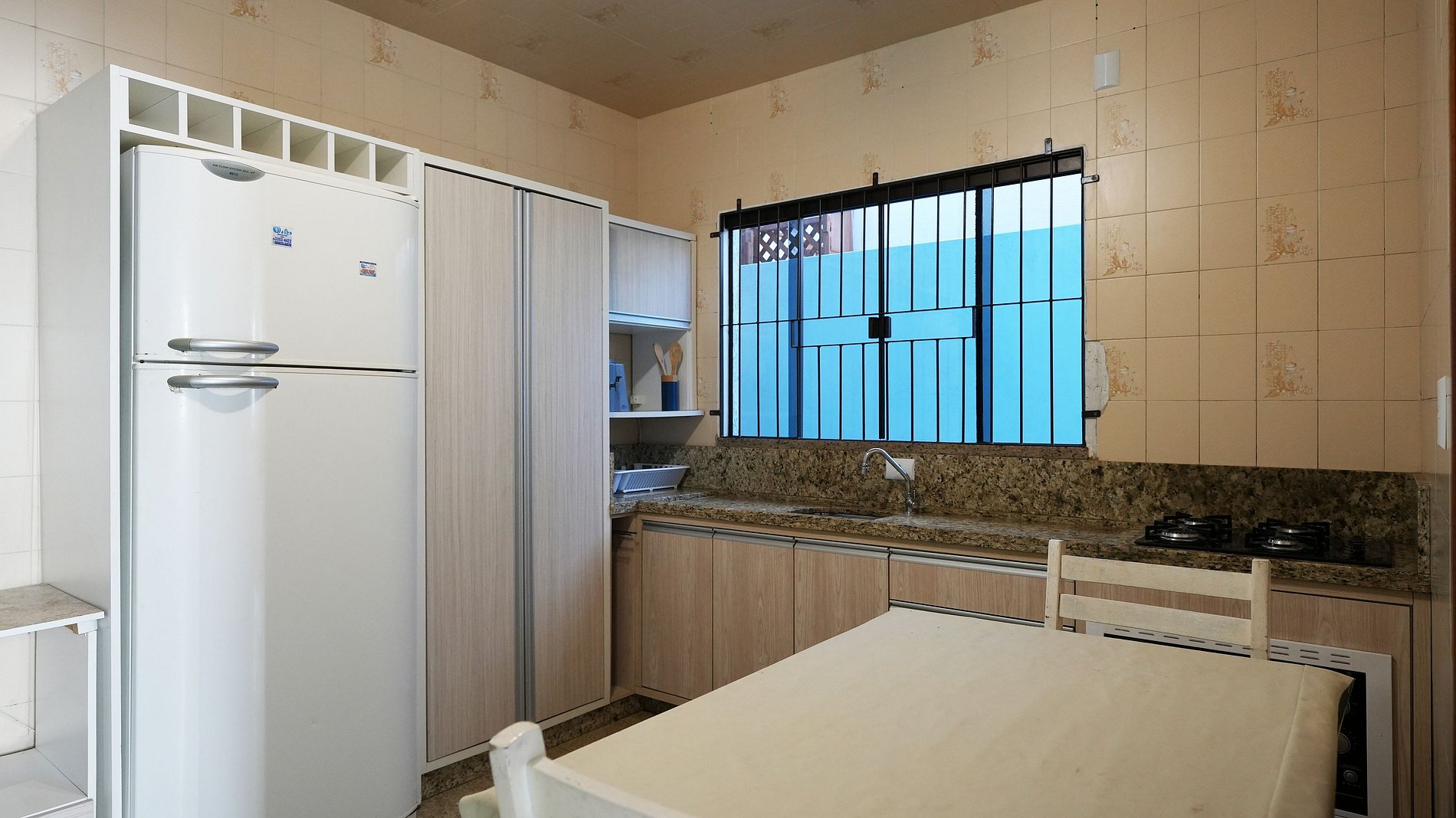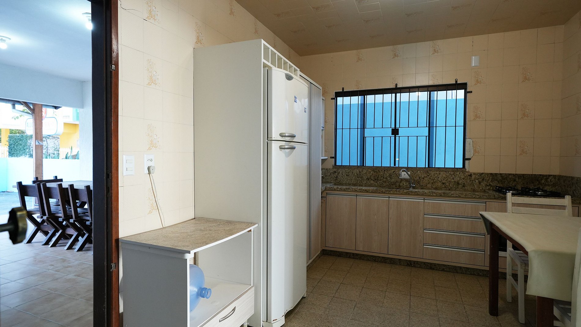 São 5 dormitórios sendo uma suíte, 3 quartos com cama de casal e 1 quarto com cama de casal e solteiro, todos com ar condicionado. Dois banheiros sociais, sala de estar e sala de jantar. Cozinha completa, fogão, forno, micro-ondas, freezer e utensílios (liquidificador, sanduicheira, panela de pressão, cafeteira e chaleira elétrica) Churrasqueira com mesa grande para confraternizações. Área de serviço com lavadora de roupas, tanque e varal externo. Máximo 15 pessoas contando com crianças.